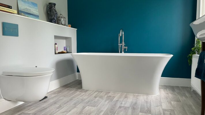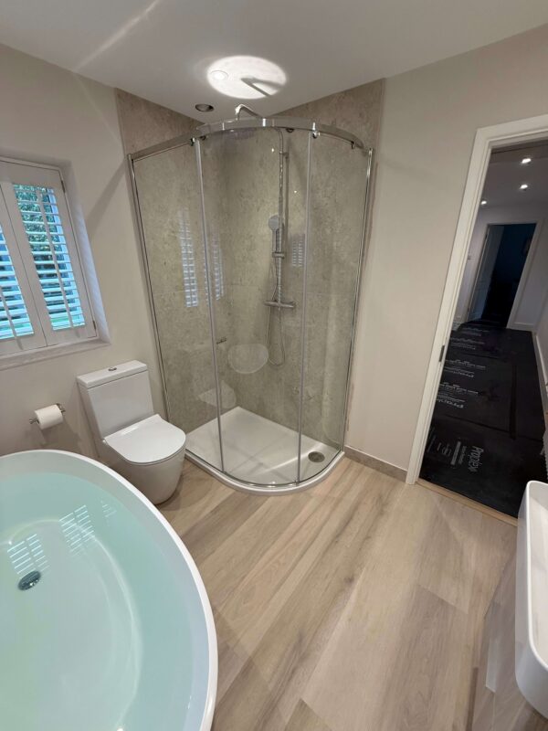 The finished bathroom feels open, airy, and refined. Every element — from the curved bath to the soft textures underfoot — works together to create a calm retreat that’s practical for everyday use yet indulgent enough for moments of relaxation.
